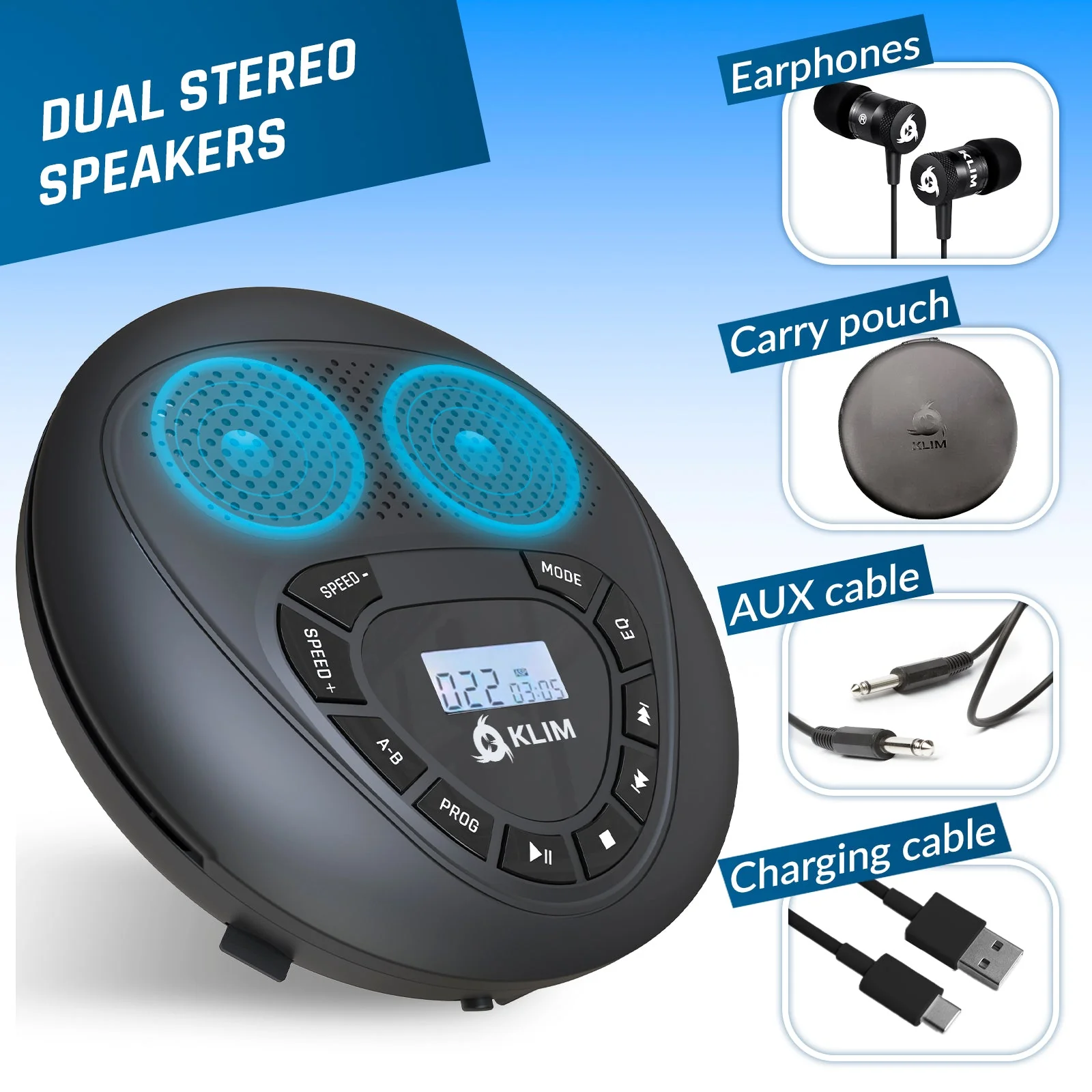 - FOR AUDIO FANS, KIDS, ELDERLY, MUSICIANS, STUDENTS, CARS & AUDIOBOOKS: Whether you're looking for an audiobook player, cd player portable with auto resume and speakers for your audio books, speed control for your music practice, AUX for car connections: the KLIM Speaker is a compact cd player packed with functionality and also easy to use for elderly and kids.
